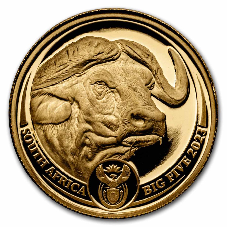 На аверсе монеты изображен буйвол. Ниже страна происхождения "SOUTH AFRICA" (ЮАР), серийное название "BIG FIVE" и год чеканки "2023".
