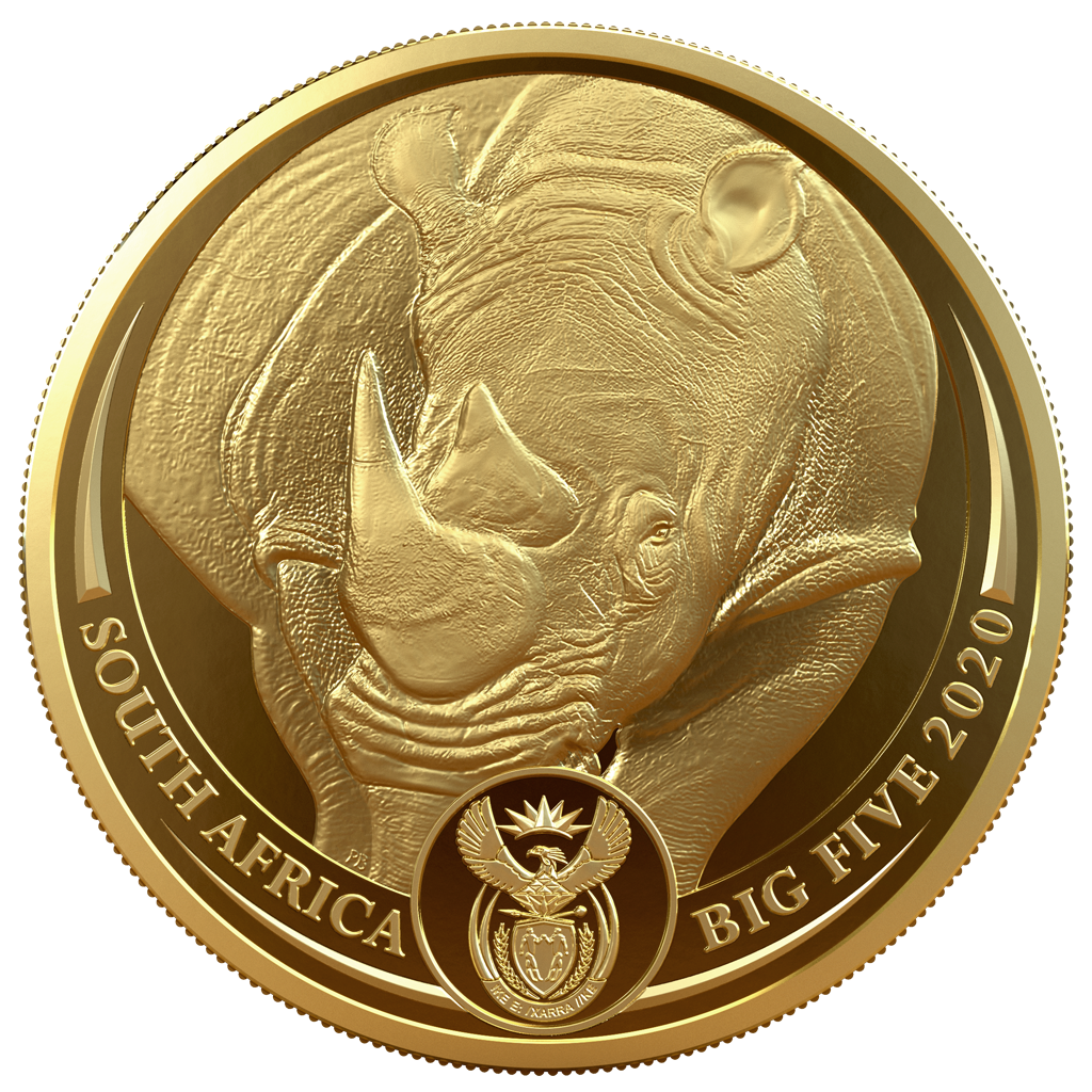 На аверсе монеты изображен носорог. Ниже страна происхождения "ЮЖНАЯ АФРИКА" (ЮАР), серийное название "БОЛЬШАЯ ПЯТЕРКА" и год чеканки "2020".
