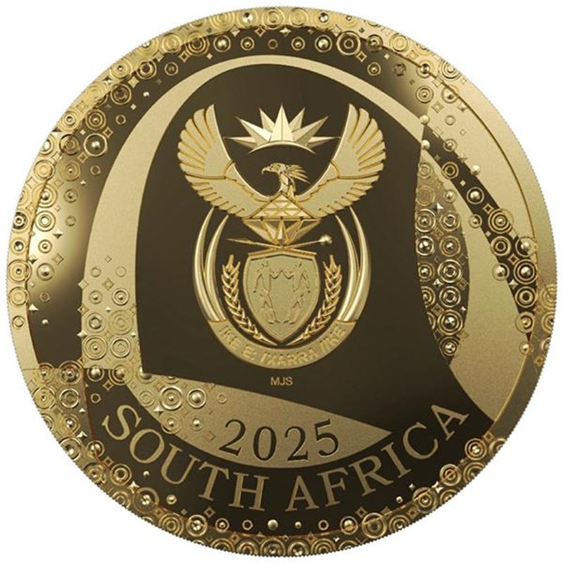 На аверсе изображен герб ЮАР на фоне африканского орнамента. Под ним инициалы дизайнера MJS (MJ Scheepers). Ниже: 2025 SOUTH AFRICA (год чеканки, страна-эмитент).