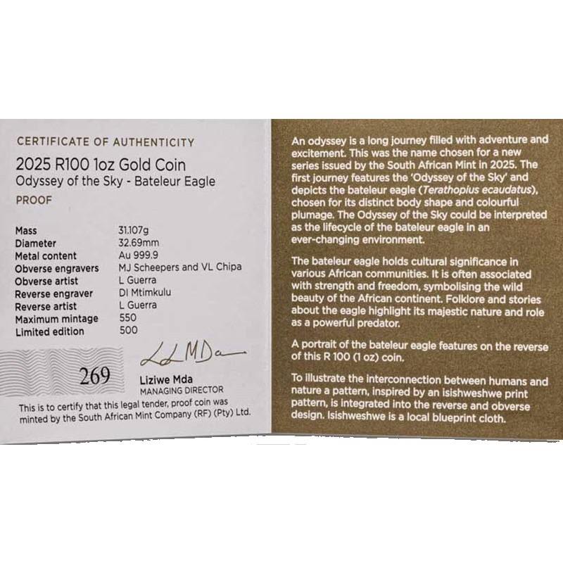 Золотая монета ЮАР "Одиссея небесного орла-бательера" 2025 г.в. (пруф), 31.1 г чистого золота (проба 9999)