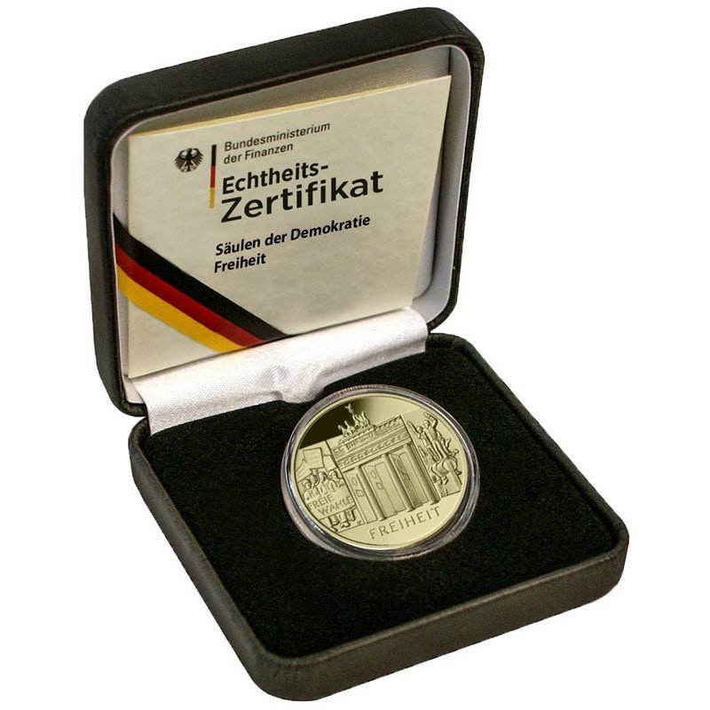 Третий и последний выпуск серии немецких золотых монет «Свобода» весом в полунции золота и номиналом 100 евро посвящена девизу «Столпы демократии — единство, справедливость и свобода». Это центральные концепции немецкой демократии. Они закреплены в Основном законе и присутствуют в государственном гимне: единство, справедливость и свобода. Бранденбургские ворота в Берлине, которые не только считаются одной из важнейших достопримечательностей немецкой столицы, но и представляют Германию во всем мире. Обладая символической силой, Бранденбургские ворота символизируют преодоление разделения Германии и свободу.