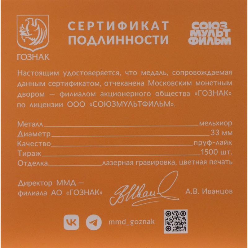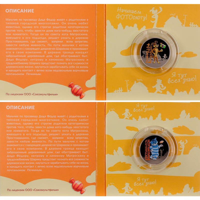 Набор из двух медно-никелевых жетонов 2025 года посвящен героям мультфильмов о «Простоквашино» - Шарику и Матроскину. У них качество пруф-лайк и селективная окраска. Поставляются в блистере. Тираж: 1500 штук.