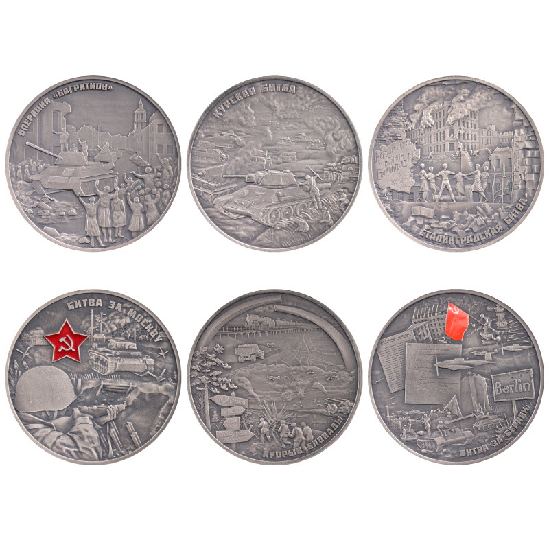 Набор из 6-ти серебряных жетонов 2025 года посвящен 80-летию Победы  советского народа в Великой Отечественной войне 1941–1945 гг. У них качество античной отделки. Поставляется в деревянном футляре. Тираж: 30 наборов.