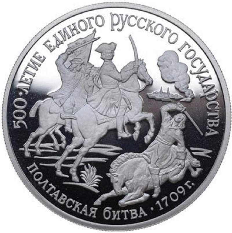 Изображение батальной сцены. Надписи — 500-ЛЕТИЕ ЕДИНОГО РУССКОГО ГОСУДАРСТВА ПОЛТАВСКАЯ БИТВА 1709 Г.