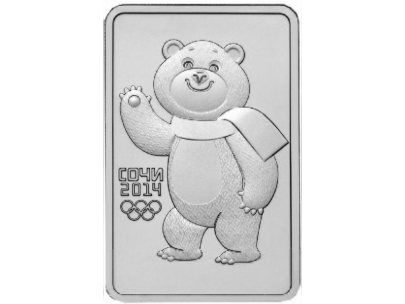 Реверс: рельефное изображение Белого Мишки - официального талисмана XXII Олимпийских зимних игр 2014 года в г. Сочи, слева от него в две строки - надпись: "СОЧИ" и дата: "2014", под ними - пять Олимпийских колец.