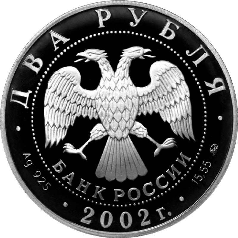 в центре диска - эмблема Банка России (двуглавый орел с опущенными крыльями, под ним надпись полукругом "БАНК РОССИИ"), обрамленная кругом из точек и надписями по кругу: вверху - "ДВА РУБЛЯ", внизу - "2002 г.", слева - обозначение металла, проба сплава, справа - содержание драгоценного металла в чистоте и товарный знак монетного двора.