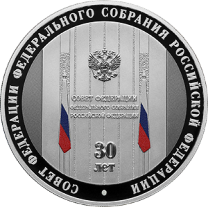 на матовом поле – рельефное изображение стелы из фойе здания Совета Федерации Федерального Собрания Российской Федерации и выполненное в цвете изображение расположенных с двух сторон от стелы флагов Российской Федерации; имеются рельефные надписи: по окружности, разделенная точкой, – «СОВЕТ ФЕДЕРАЦИИ ФЕДЕРАЛЬНОГО СОБРАНИЯ РОССИЙСКОЙ ФЕДЕРАЦИИ», внизу в две строки – «30 ЛЕТ».