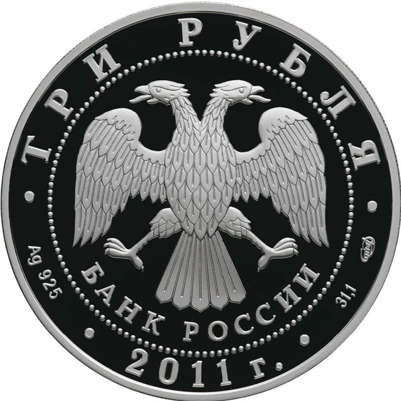 в центре — эмблема Банка России (двуглавый орёл с опущенными крыльями, под ним — надпись полукругом «БАНК РОССИИ»), обрамленная кругом из точек и надписями по кругу — вверху: «ТРИ РУБЛЯ», внизу: слева — обозначения драгоценного металла и пробы сплава, в центре — дата выпуска «2011 г.», справа — содержание химически чистого металла и товарный знак монетного двора.