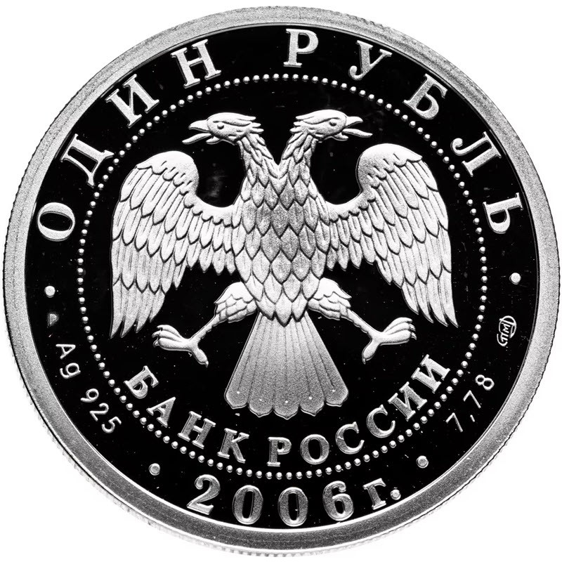 На аверсе изображена эмблема Банка России (двуглавый орел с опущенными крыльями), под ним надпись: БАНК РОССИИ. Вдоль канта надпись: ОДИН  РУБЛЬ • Ag 925 • 2006 г. • 7,78 СПМД • (номинал, вес и проба серебра, год чеканки, монограмма Санкт-Петербургского монетного двора).