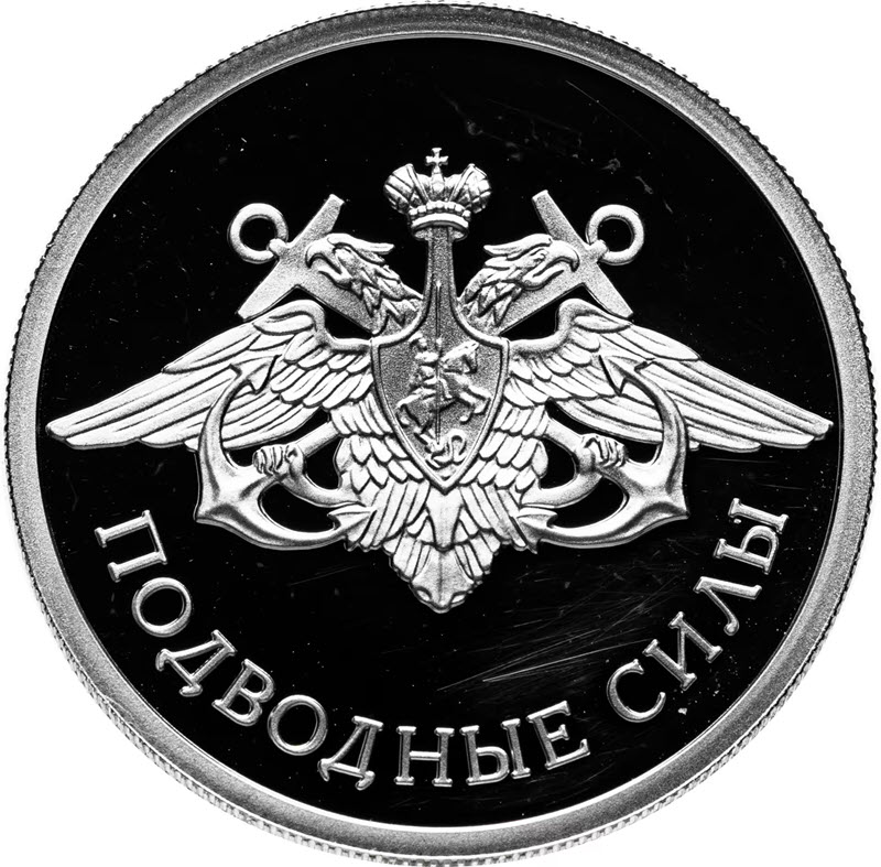 На реверсе изображена эмблема ВМФ. Внизу надпись: ПОДВОДНЫЕ СИЛЫ.
