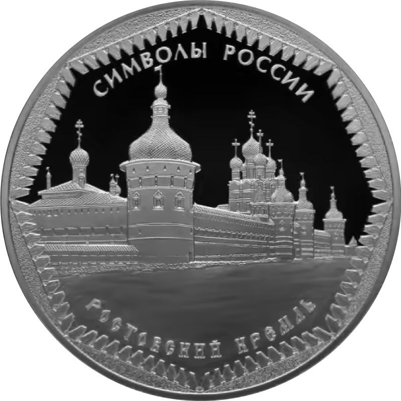 в центре диска в картуше – изображение Ростовского кремля, надписи вдоль канта – вверху: "СИМВОЛЫ РОССИИ", внизу: "РОСТОВСКИЙ КРЕМЛЬ".
