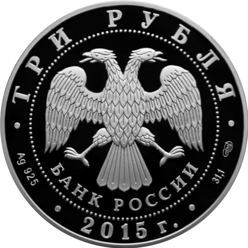 в центре – эмблема Банка России (двуглавый орёл с опущенными крыльями, под ним – надпись полукругом "БАНК РОССИИ"), обрамленная кругом из точек и надписями по кругу – вверху: "ТРИ РУБЛЯ", внизу: слева – обозначения драгоценного металла и пробы сплава, в центре – год выпуска "2015 г.", справа – содержание химически чистого металла и товарный знак монетного двора.