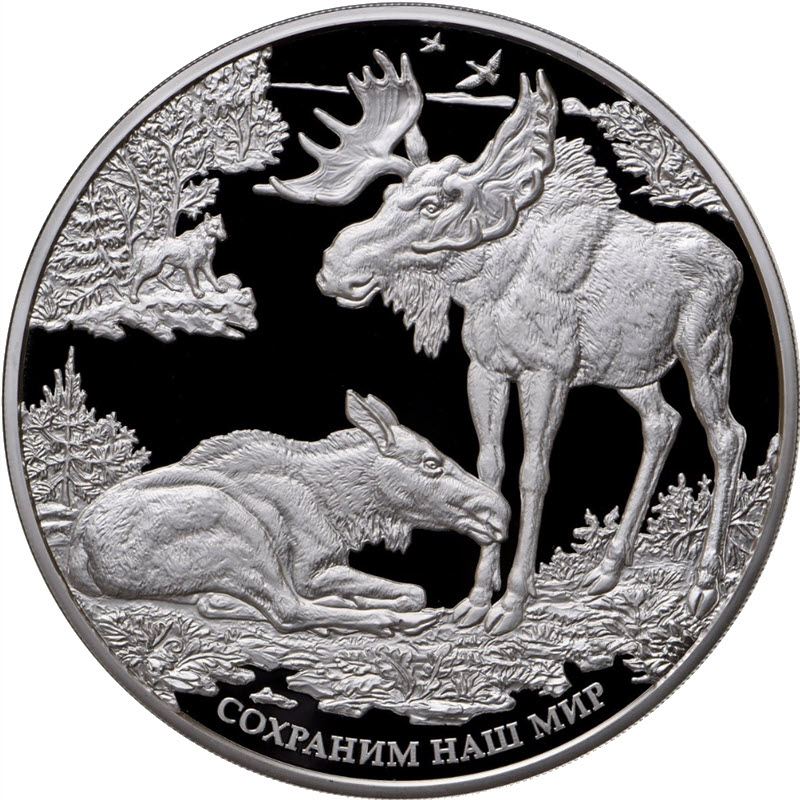 На реверсе изображение пары лосей на фоне леса. На дальнем плане волк и две летящие птицы. Внизу вдоль канта надпись: СОХРАНИМ НАШ МИР.