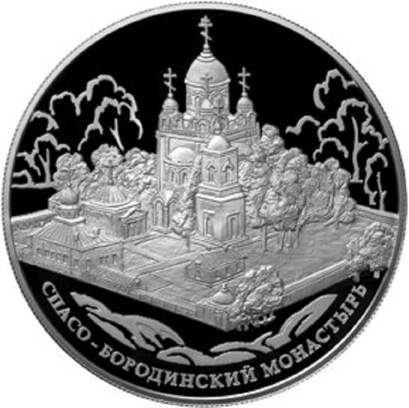 в центре диска на прямоугольной площадке - рельефные изображения собора и церквей монастыря, окруженных деревьями, на втором плане - контурные изображения деревьев, внизу у канта - надпись: "СПАСО-БОРОДИНСКИЙ МОНАСТЫРЬ).