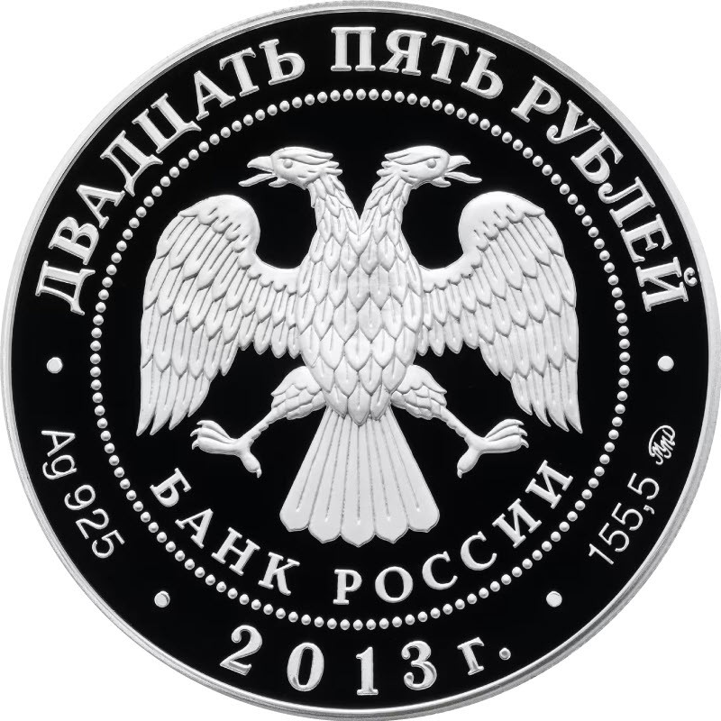 в центре - эмблема Банка России (двуглавый орёл с опущенными крыльями, под ним - надпись полукругом "БАНК РОССИИ"), обрамленная кругом из точек и надписями по кругу - вверху: "ДВАДЦАТЬ ПЯТЬ РУБЛЕЙ", внизу: слева - обозначения драгоценного металла и пробы сплава, в центре - дата выпуска "2013 г.", справа - содержание химически чистого металла и товарный знак монетного двора.