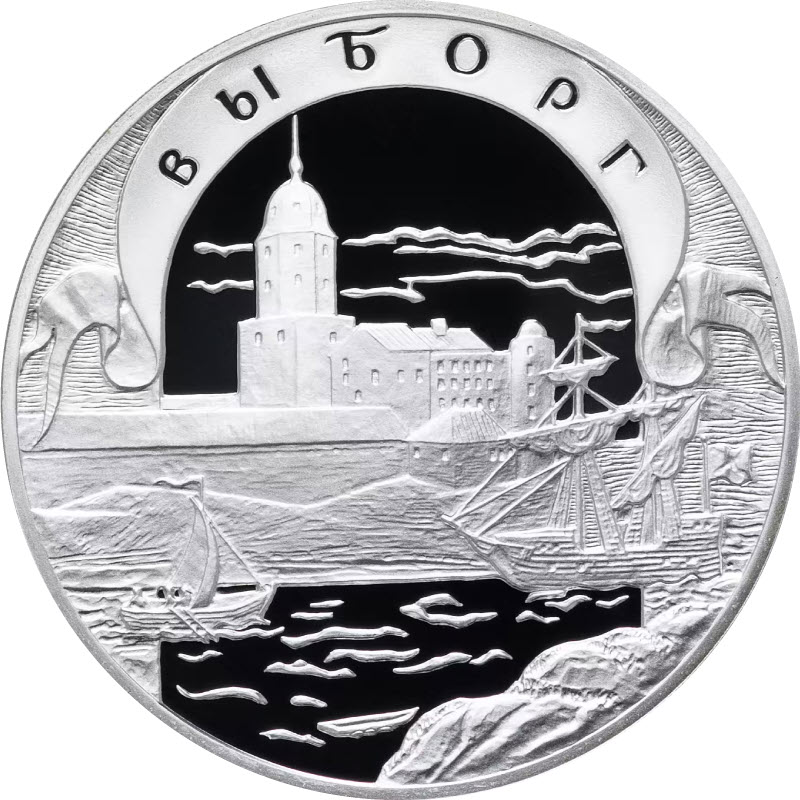 панорама крепости в обрамлении стилизованного окна-арки, на первом плане - два плывущих парусных судна, вверху по окружности на ленте - надпись: "ВЫБОРГ".