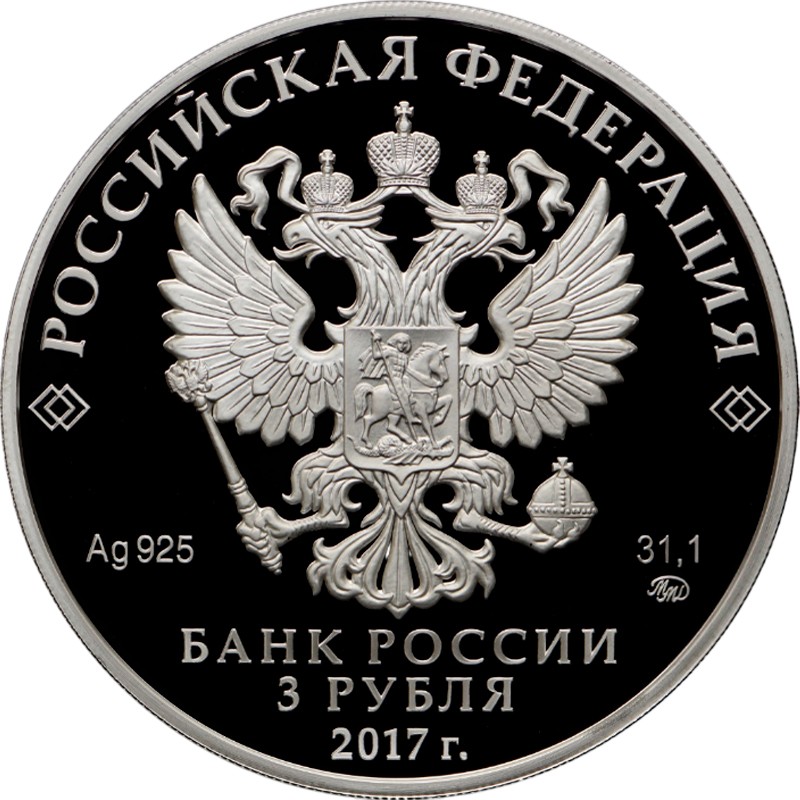 В центре – рельефное изображение Государственного герба Российской Федерации, над ним вдоль канта надпись полукругом: РОССИЙСКАЯ ФЕДЕРАЦИЯ (страна-эмитент), обрамленная с обеих сторон сдвоенными ромбами, внизу под гербом: слева – Ag 925 (проба серебра), справа – 31,1 ММД (вес серебра и монограмма монетного двора), внизу в центре в три строки – надписи: БАНК РОССИИ 3 РУБЛЯ 2017 г. (банк, номинал, год чеканки).