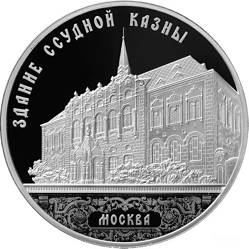 Серебряная монета Банка России из серии «Архитектурные шедевры России» посвящена зданию Ссудной казны в Настасьинском переулке в городе Москве.