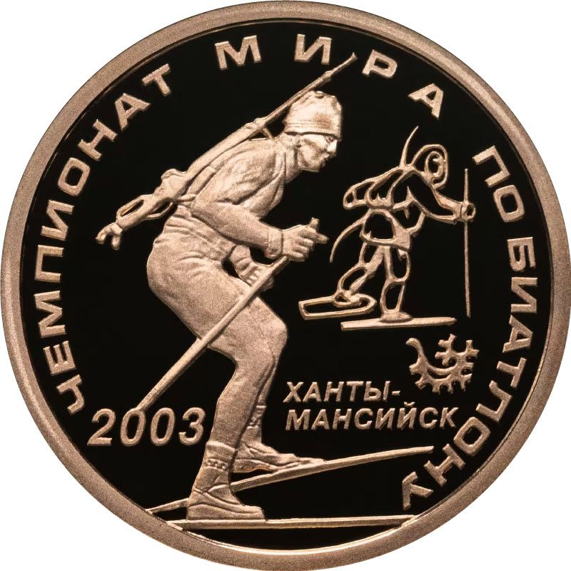 биатлонист на дистанции, внизу слева - дата "2003", справа - надпись в две строки: "ХАНТЫ-МАНСИЙСК", выше - стилизованные изображения северного узора и бегущего на лыжах охотника, по окружности - надпись: "ЧЕМПИОНАТ МИРА ПО БИАТЛОНУ".