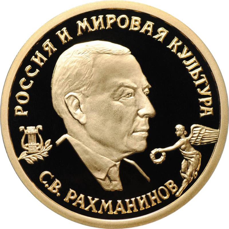 Изображение С.В.Рахманинова, слева - лира и лавровая ветвь, справа - муза с венком, по окружности надписи: вверху - "РОССИЯ И МИРОВАЯ КУЛЬТУРА", внизу - "С.В.РАХМАНИНОВ".