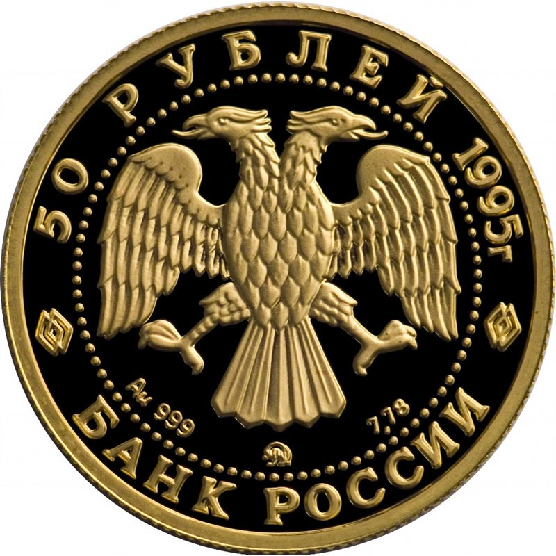 На аверсе герб Банка России (двуглавый орел с опущенными крыльями). Под ним надпись: Au 999 ММД 7,78 (вес и проба золота, монограмма Московского монетного двора). Вверху вдоль канта надпись: 50 РУБЛЕЙ 1995 г. (номинал, год чеканки), внизу: БАНК РОССИИ.