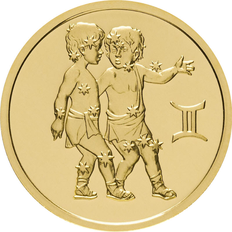 Российская золотая монета высшей пробы, посвященная знаку зодиака "Близнецы". Созвездие Близнецов содержит 121 звезду, видимую невооружeнным глазом. Находится в Северном полушарии.