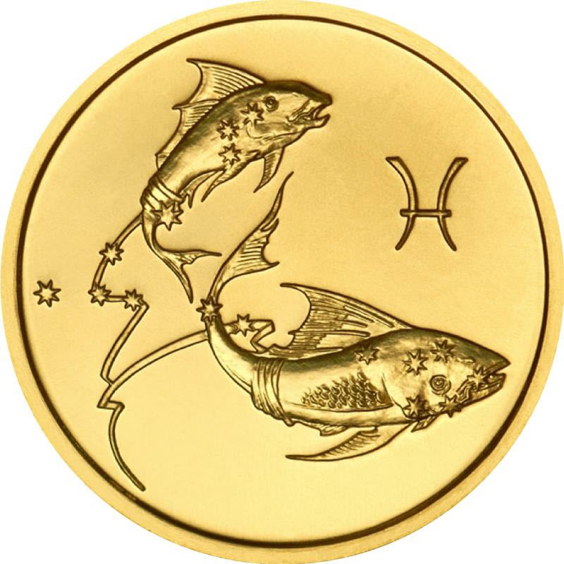 Российская золотая монета высшей пробы, посвященная знаку зодиака "Рыбы".