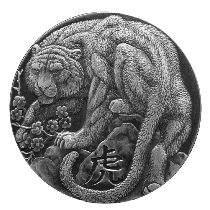 Дизайн жетона восхищает грацией и четкостью силуэта хозяина грядущего года - Тигра. Нежные веточки с цветами, у сильных когтистых лап могучего зверя придают изображению сентиментальность и гармонию.