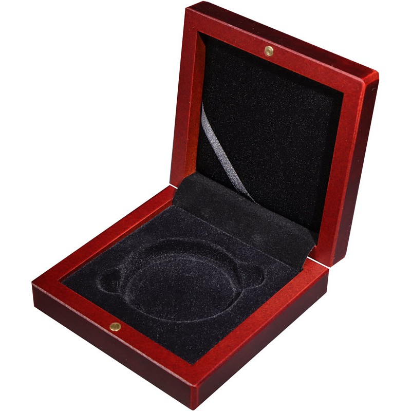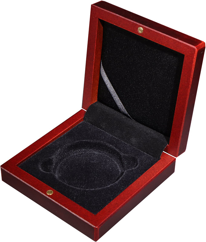 Наружный размер: 100 Х 100 Х 32 мм. Бархатный ложемент черного цвета: диаметр 58 мм, глубина 6 мм.